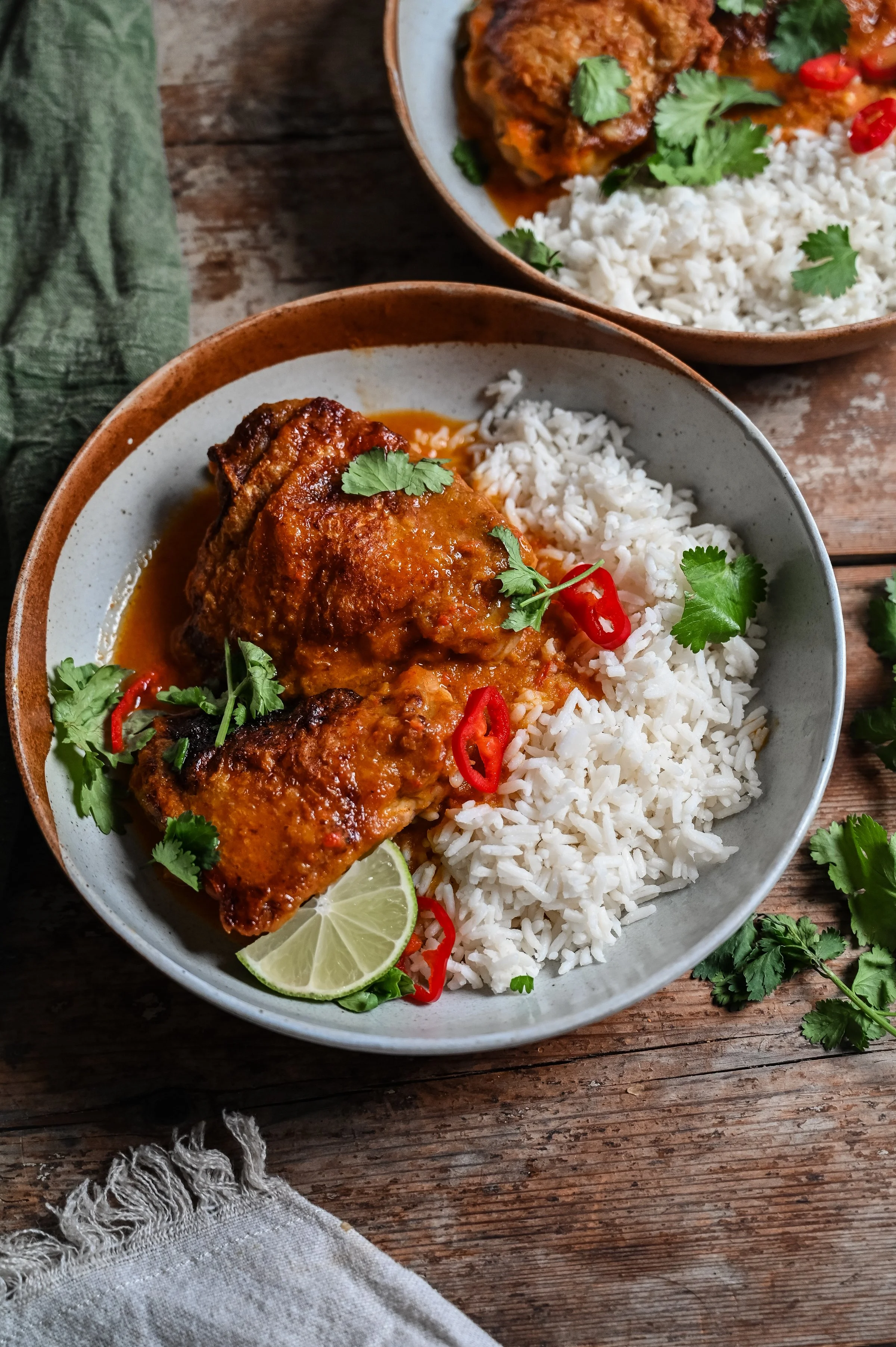 The chicken is browned first to crisp the skin, then baked in coconut milk and stock so the sauce reduces and flavours the meat while leaving the skin golden.