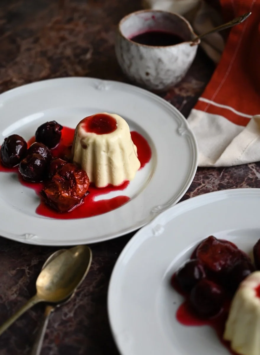 A silky panna cotta infused with fig leaves for a delicate floral note, served with roasted stone fruit in red wine syrup. A light, elegant summer dessert that’s easy to prepare ahead.