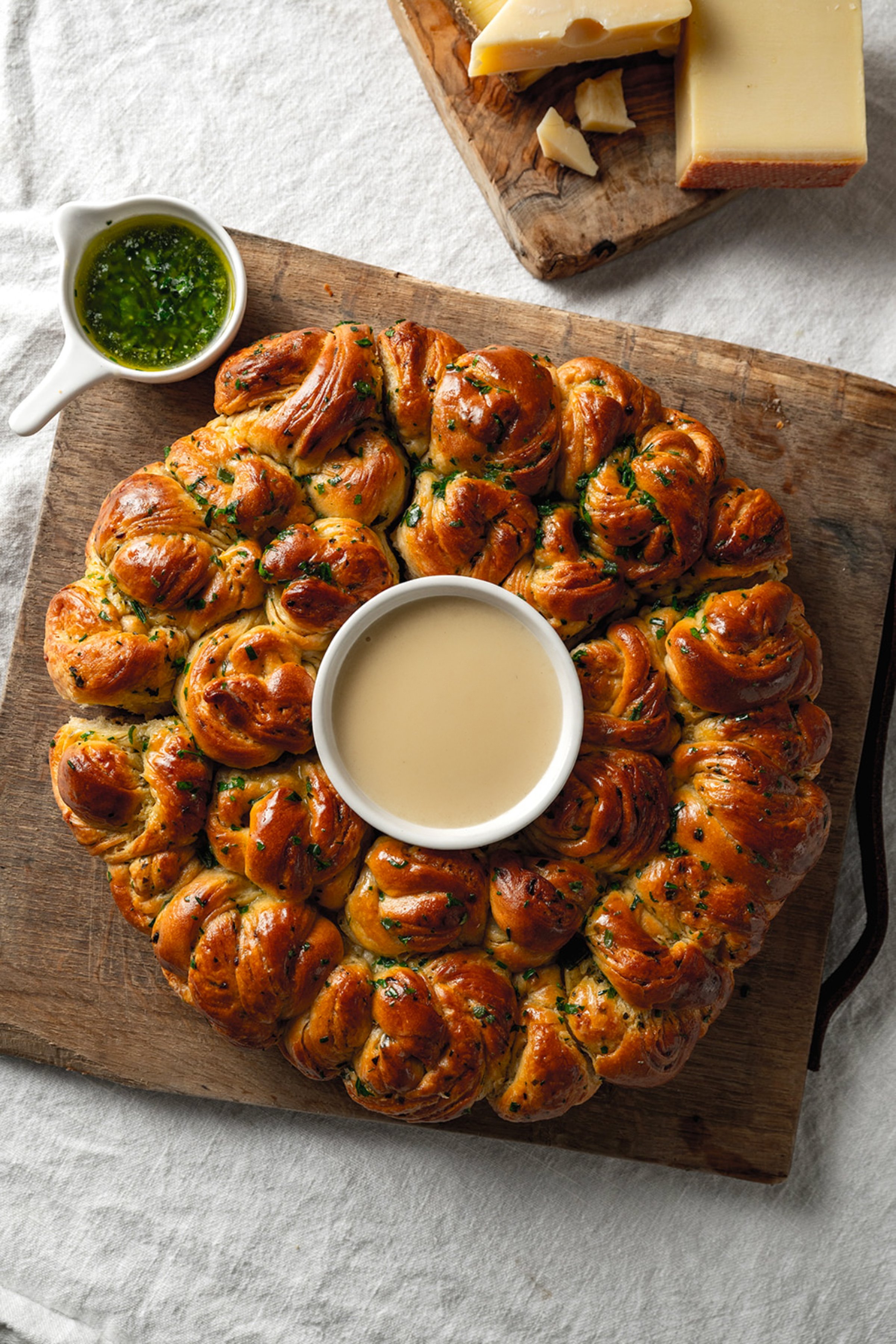 Garlic Butter Tear and Share Wreath with Cheese Fondue