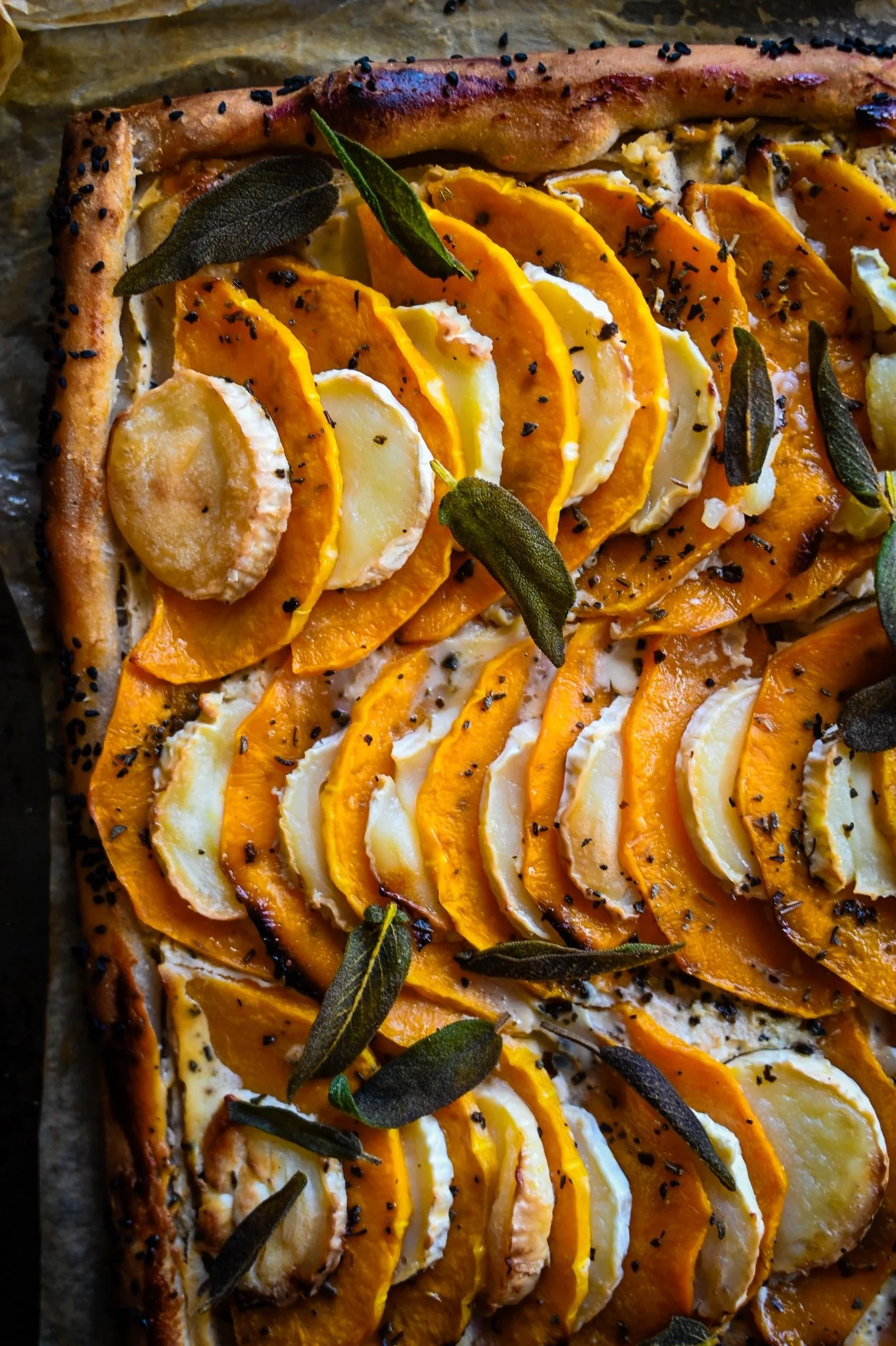 A crisp puff pastry tart layered with roasted butternut squash, tangy goat’s cheese, and honey, finished with crispy sage and nigella seeds. A simple but impressive autumn tart.