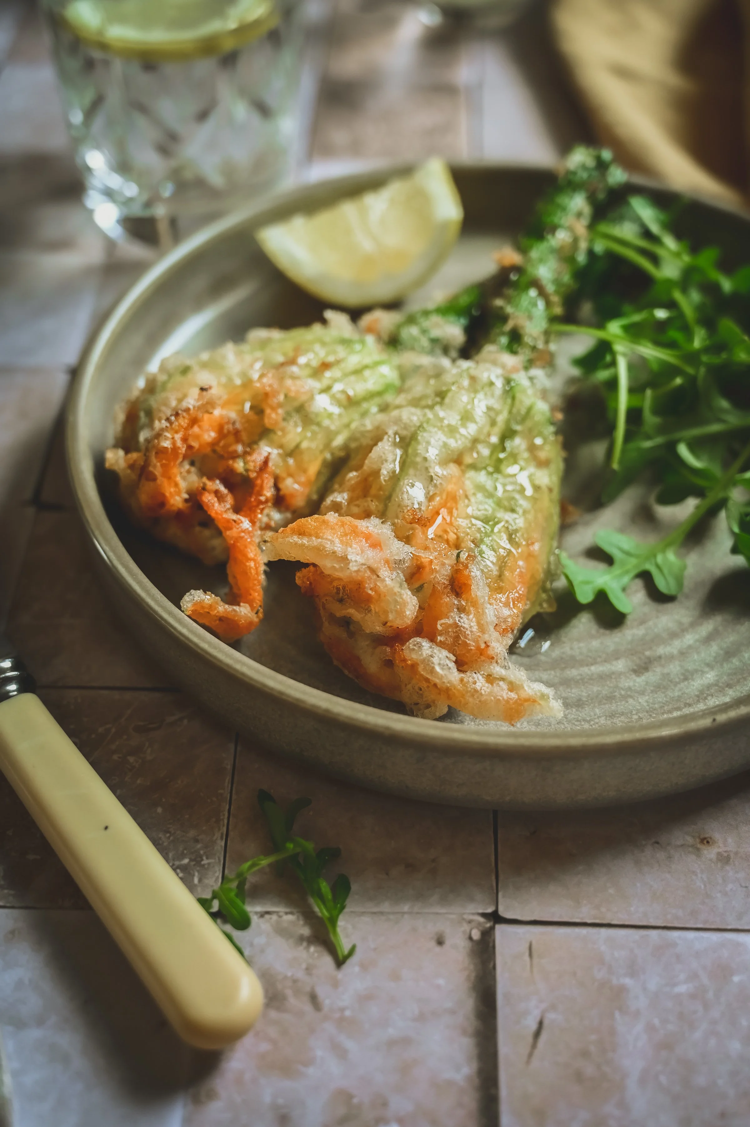 Courgette flowers stuffed with goats cheese, ricotta and herbs, dipped in a light batter and fried until crisp. A seasonal summer starter with honey drizzle.