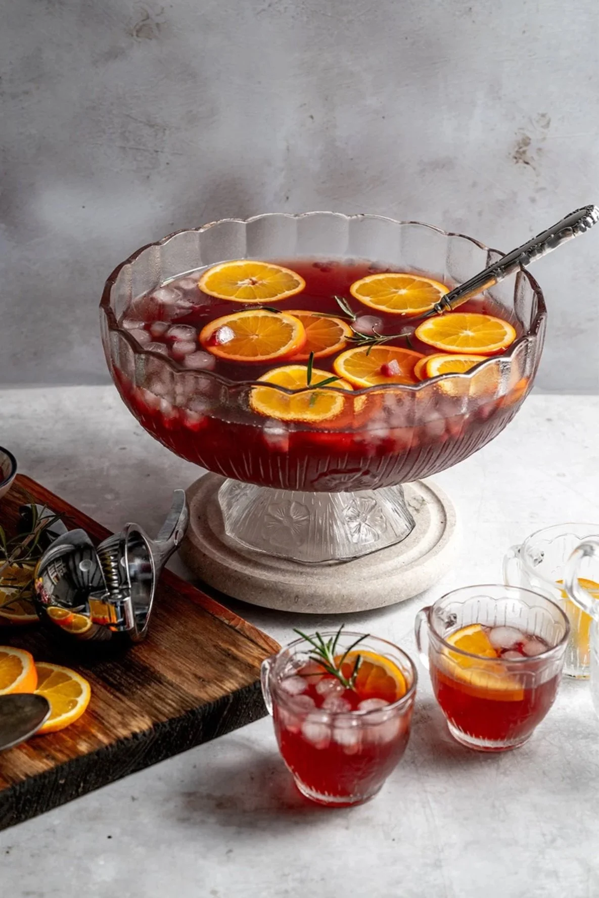 Beyond the orange slices and pomegranate ice cubes, you could add fresh rosemary sprigs to individual glasses, or float edible flowers in the punch bowl for extra visual impact.